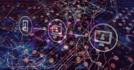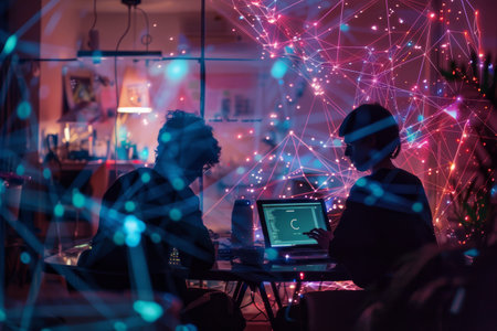 This stunning abstract image features a futuristic digital network with glowing pink nodes, illuminating connections across a dark surface, symbolizing technology and communication.