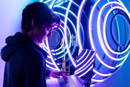 Person works with laptop on neon background, view of hands and digital data. Theme of computer technology, privacy, network, cyber security, information, tech, protection. Generative AI