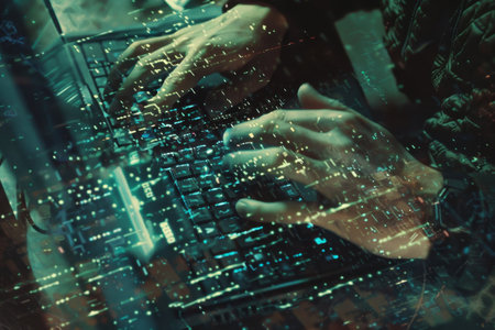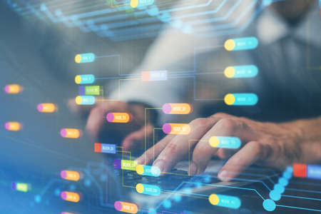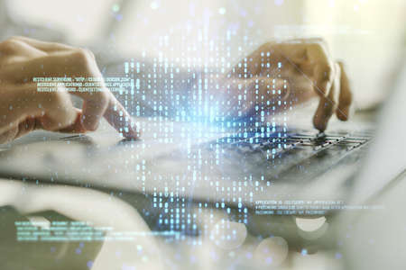 Abstract creative coding illustration with hands typing on laptop on background, software development concept. Multiexposure