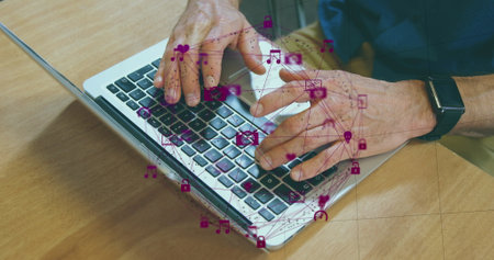 Image of globe of digital icons spinning over mid section of a man using a laptop at office. Global networking and business technology concept