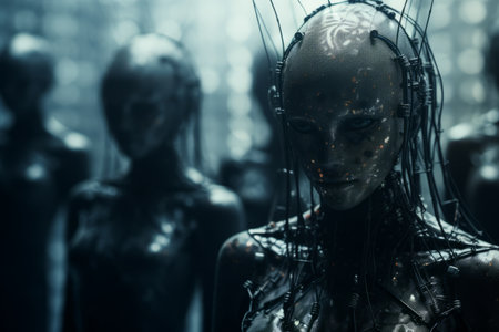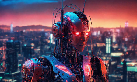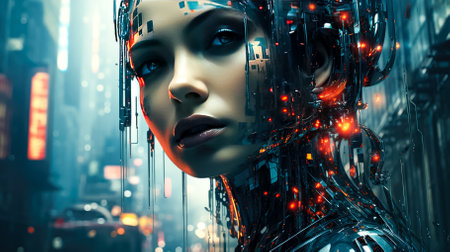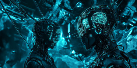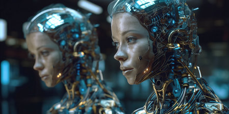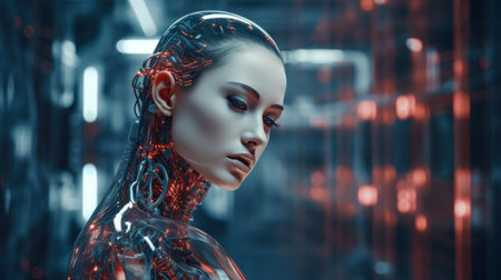 Cyborg workforce integrates seamlessly, fueled by AI collaboration and human-robot synergy. close-up