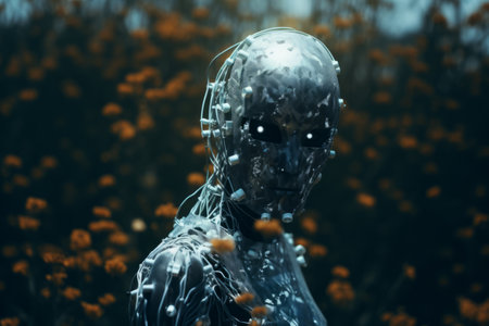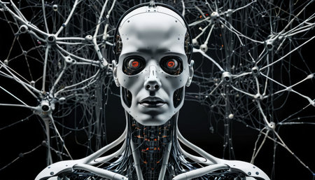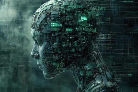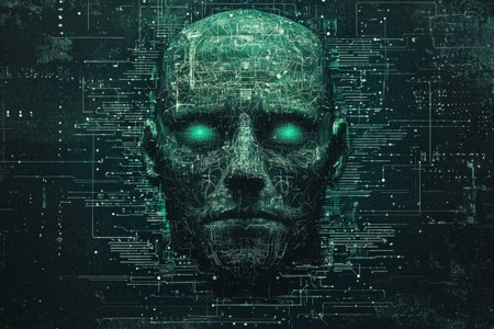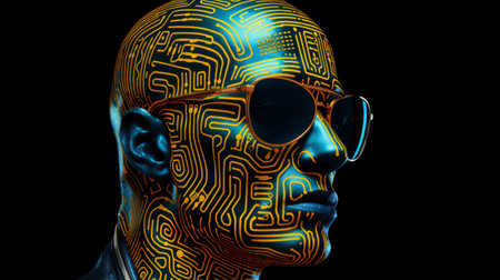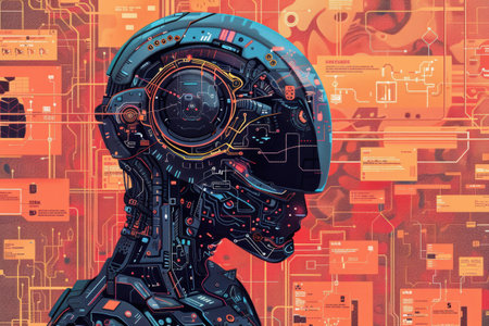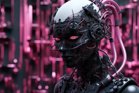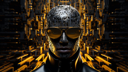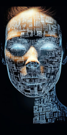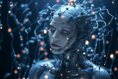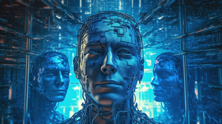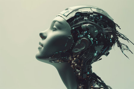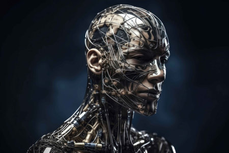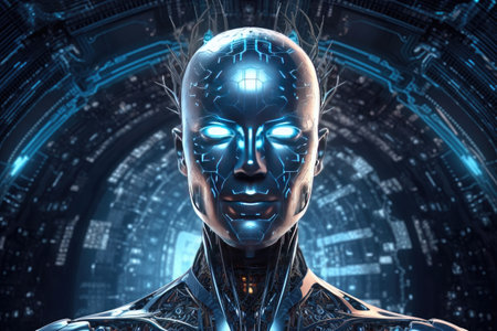 Illustration of Human-like Artificial Intelligence Head with Electronic Circuit Skin Texture and Computer Control Like