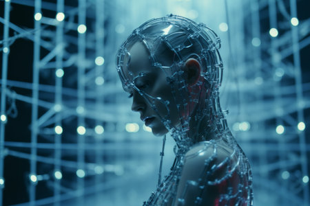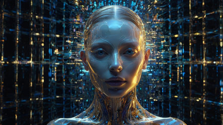 Humanoid figure features detailed circuitry and flowing golden hair, embodying a fusion of technology and artistry, creating a striking visual narrative of innovation
