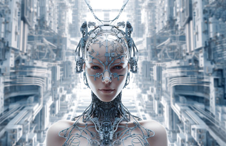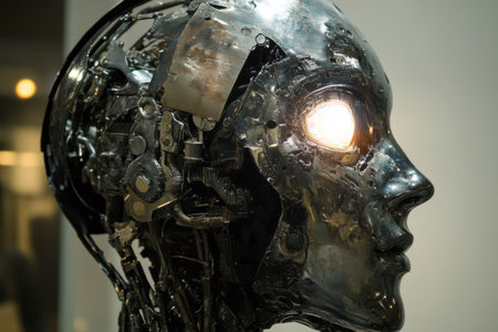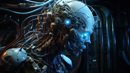 Cybernetic head with elaborate wiring and shining eyes positioned in a high-tech environment. Luminous background enhances futuristic aesthetics.