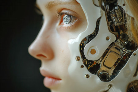 Side profile of a humanoid face shows advanced mechanical implants and a glowing robotic eye, showcasing a futuristic aesthetic.