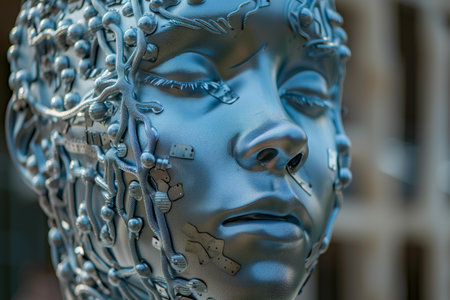 Intricate metal sculpture capturing a human face with technology elements, in detailed closeup