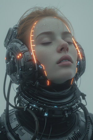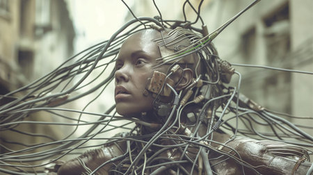 The image portrays a person intricately connected to a network, rendered in a cybernetic sci-fi style. This visual symbolizes the fusion of human and technology, encapsulating the idea of being deeply integrated into a futuristic digital network, blurring the lines between organic and artificial.