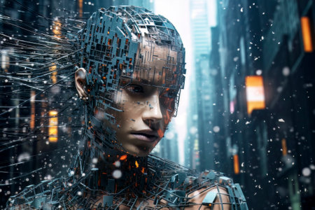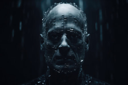 Dark moody portrait of cyborg face with data streams in the rain. Generative AI