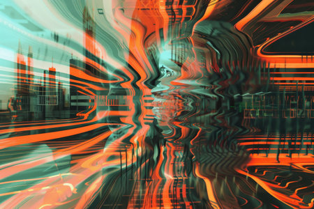 Glitchy patterns distort reality in an abstract cityscape of orange and green hues, Glitchy patterns distorting reality