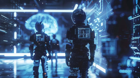 Robots exploring futuristic laboratory analyzing data on computer screens