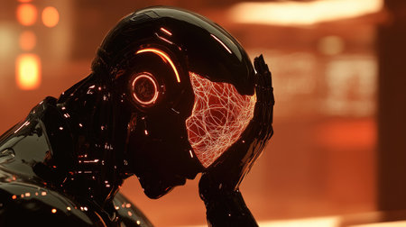 A futuristic AI robot holding its head in contemplation, with glowing neural patterns visible on its surface.