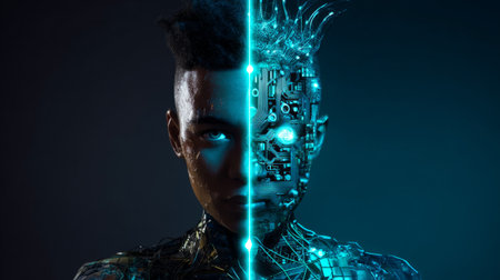 Symbiosis between human body and artificial intelligence and use of cells and partially mechanical limbs, skin, metal, visible energy flows, perfect human face. Generative AI