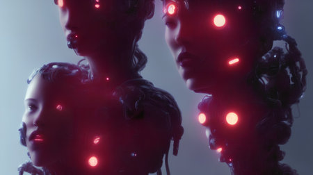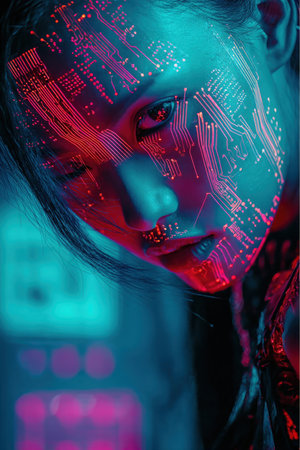 Close-up shows a woman's face, illuminated by cyan and magenta lighting, her skin decorated with glowing, circuit board patterns. Futuristic aesthetic is very apparent.