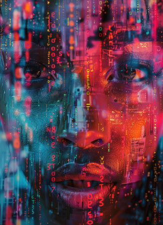 The close up picture of human face with emotionless expression that the picture has neon glitch effect that feels like from scifi or science fiction futuristic cyberpunk artstyle yet dystopia. AIGX01.