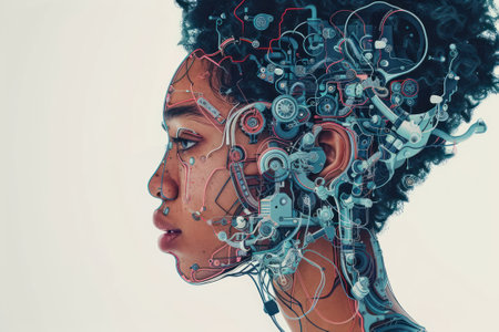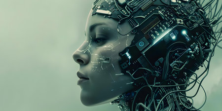 A profile portrait of a woman with intricate circuitry patterns on her face and hair. A concept of human-machine integration.