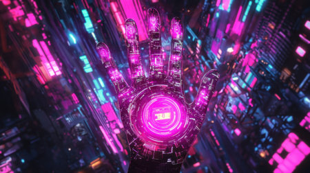This vibrant image showcases a futuristic digital hand glowing with neon colors, surrounded by abstract technology elements, perfect for projects focusing on innovation and digital art.