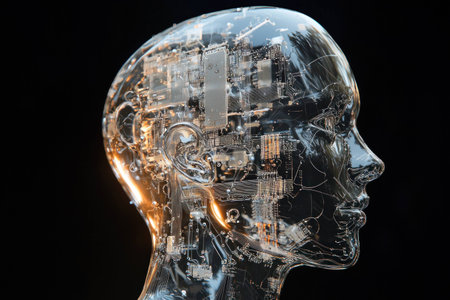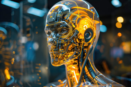 Futuristic humanoid head with illuminated circuitry inside, representing technology and artificial intelligence, showcasing innovation and advanced design.