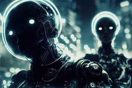 Cyborgs with glowing blue eyes in night neon metropolis
