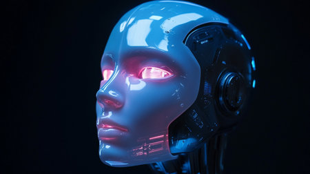 Futuristic concept. The robot's ceramic head opens to reveal a metallic brain and neon eyes. Blue neon. Nanotechnologies.