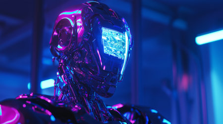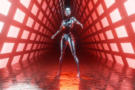 3d rendering humanoid robot with glowing lights on background, cyberpunk concept