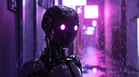 Artificial intelligence robot standing in front of neon lights in the night