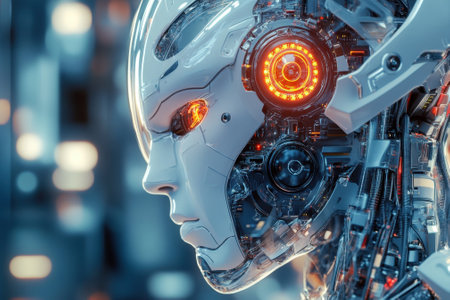 A futuristic robot head showcases glowing orange eyes and complex digital circuitry intricately designed.