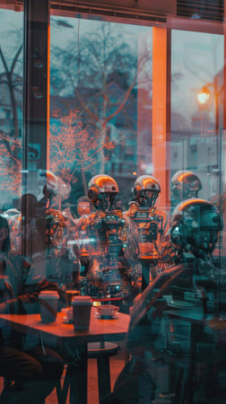 Cyberpunk robots with glowing blue eyes in night metropolis