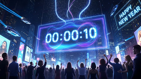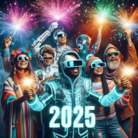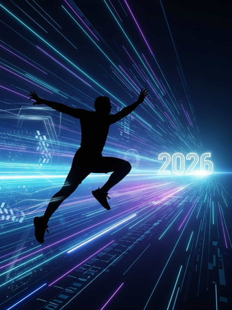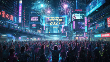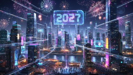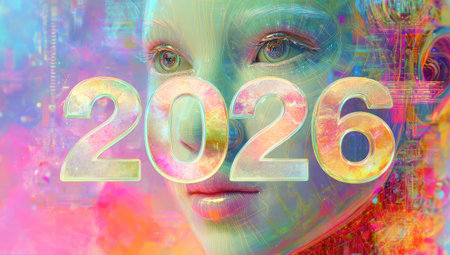 An artistic digital illustration depicts a woman's face and the year 2026. This artwork utilizes vibrant colors and a futuristic aesthetic. The overall composition suggests a theme of technological advancement. Suitable for design projects and commercial applications requiring a modern touch.