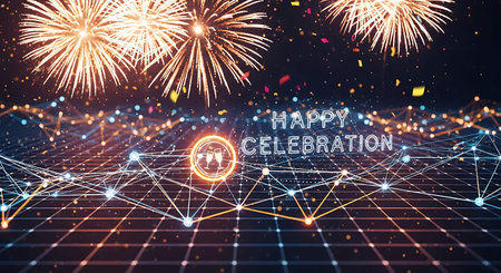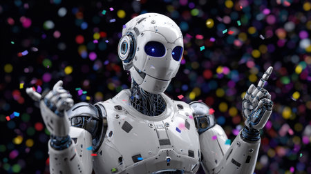 A cheerful robot stands amidst a flurry of colorful confetti, embodying a festive spirit. This vibrant image symbolizes joy, celebration, and innovation in technology.