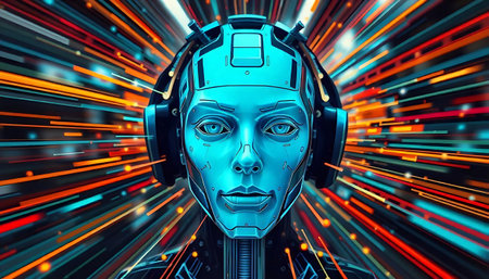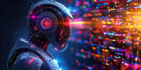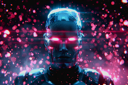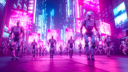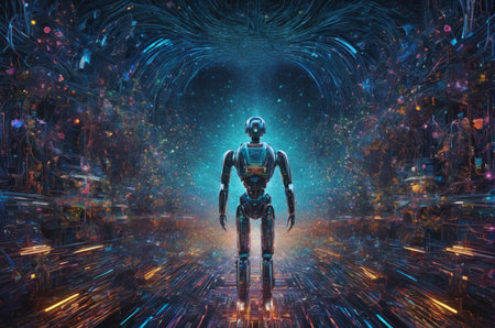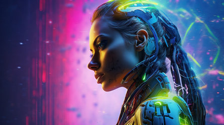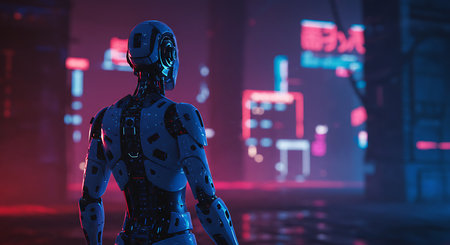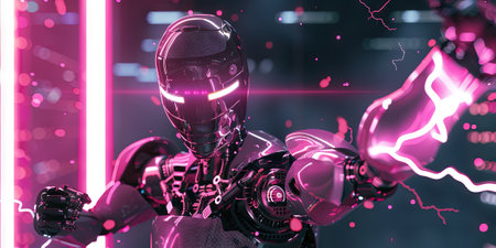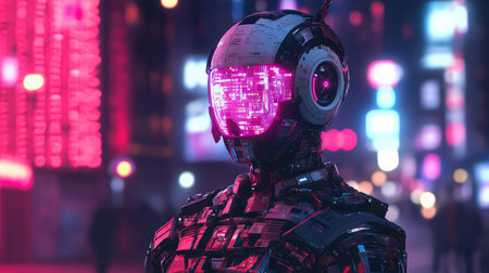 A striking futuristic robot stands tall against a backdrop of vibrant neon lights and digital patterns, embodying the fusion of technology and creativity.