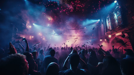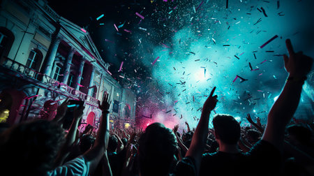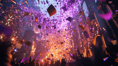 A crowd gathers in a concert venue, immersed in excitement as colorful confetti descends from above. Bright lights create an energetic atmosphere, highlighting the joy of the night.