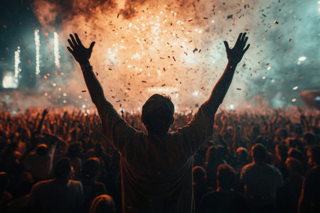 Man is raising his arms while enjoying a music festival with colorful fireworks exploding above.