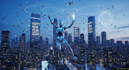 Cyborg robot holding a sparkler, dark background with bokeh lights, digital illustration