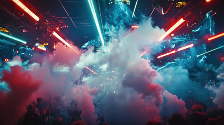 A high-energy nightclub scene with intersecting red and blue lasers illuminating dense smoke.