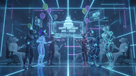 People interacting in a futuristic room with advanced technology and modern design, A futuristic depiction of a virtual party where guests interact through holographic visuals