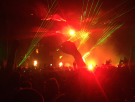 Audience with hands raised at a music festival and lights streaming down from above the stage. Soft focus, high ISO, grainy image.