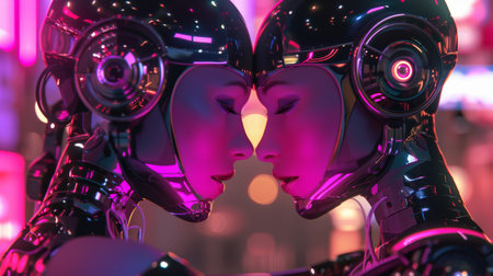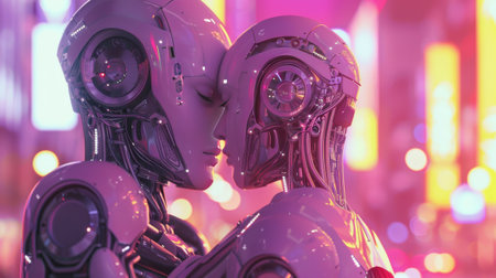 A couple of cyborgs are in love. An intelligent male robot holds an intelligent female robot in his arms. Artificial intelligence. Symmetrical modern illustration of romantic relationships between