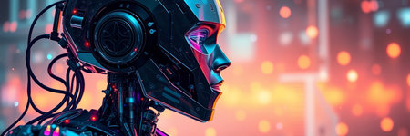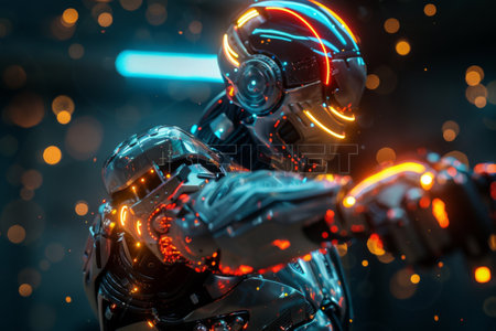 3d rendering humanoid robot with glowing lights on background, cyberpunk concept