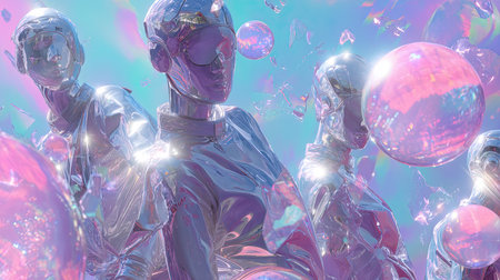 people in futuristic glittery suits retro style in night disco club party. AI generated illustration