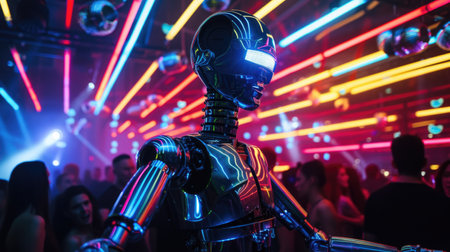 Futuristic Robot DJ Performing at a Neon-Lit Club with Excited Crowd in the Background