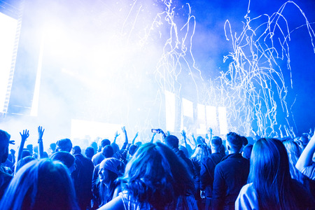 BONTIDA, ROMANIA - JULY 14, 2017: Crowd of people partying during a NERO concert at Electric Castle festival. Confetii cannons throwing confetti on crowd