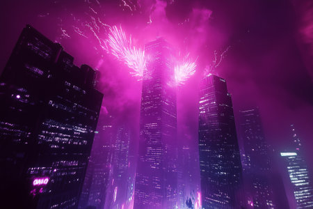 A glittering cityscape on New Years Eve with fireworks, Fireworks at Night, Colorful firework