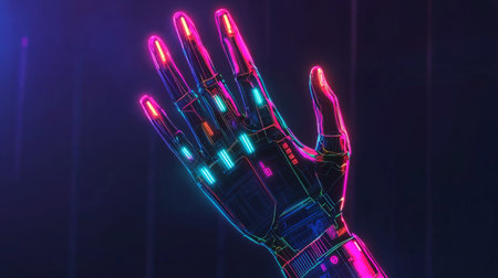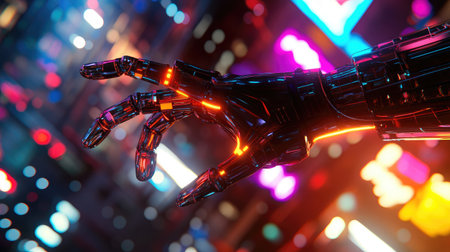 A striking image of a robotic hand reaching out, illuminated by vibrant neon lights in a dynamic urban setting, showcasing the intersection of technology and artistry.