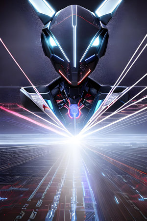 A dynamic illustration of a futuristic combat robot with glowing blue lights, firing laser weapons in a high-tech environment.. AI Generation