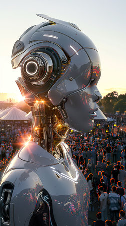 Sonic Amplification Implant, Titanium Earpiece, Enhancing Hearing Beyond Human Capabilities, Vibrant Music Festival, Clear Skies, 3D Render, Golden Hour Lighting, Depth of Field Bokeh Effect, Birds-eye view