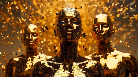 An AI generated illustration of 3 golden robots in a rain on golden particles