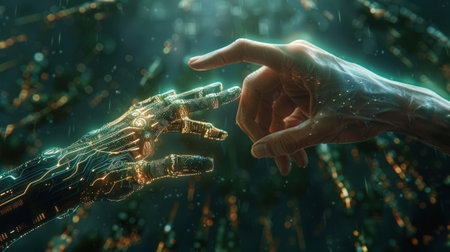 Dive into the world of artificial intelligence and machine learning with this futuristic background banner featuring the hands of a robot and a human touching amidst a big data network connection. Perfect for technology presentations, digital designs, advertisements, and branding, this visually captivating background highlights the innovative and transformative nature of AI. The design symbolizes the collaboration between humans and machines, making it ideal for projects focused on science, technology, and innovation