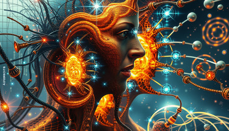 A half organic, half mechanical human head merges with a complex AI, featuring intricate cybernetic textures in vibrant sci fi colors.
