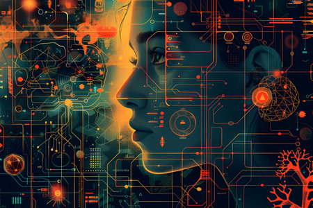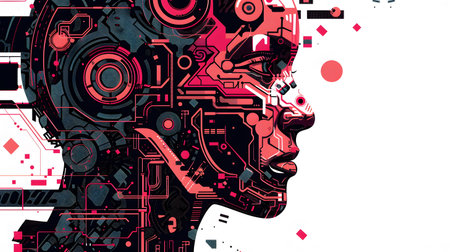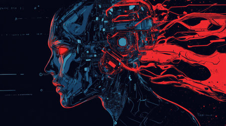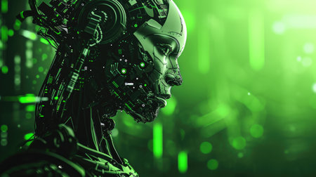 Illustration of Human-like Artificial Intelligence Head with Electronic Circuit Skin Texture and Computer Control Like