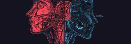 AI Generated. A futuristic robotic head with glowing circuitry in a dimly lit space